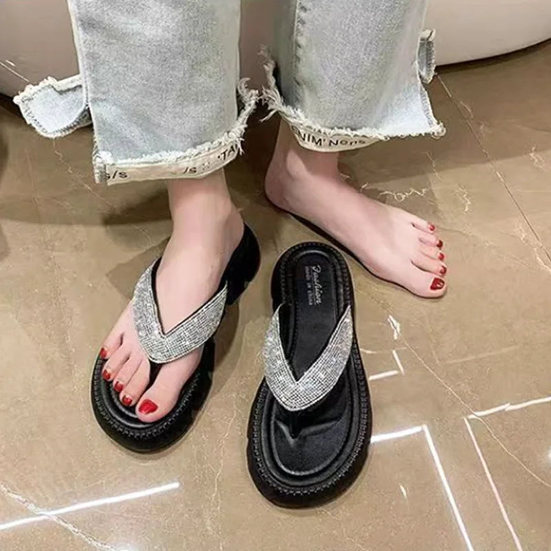 Woman 2024 Trend Rhinestone Flip-flop Slippers Thick Soles Outdoor Wear Fashionable Beach Shoes Indoor Anti Slip Sandals Shoes